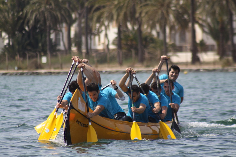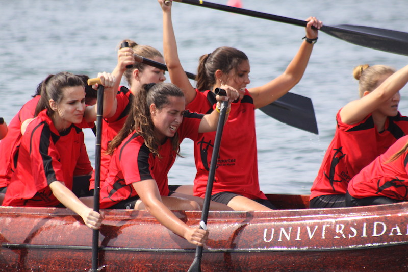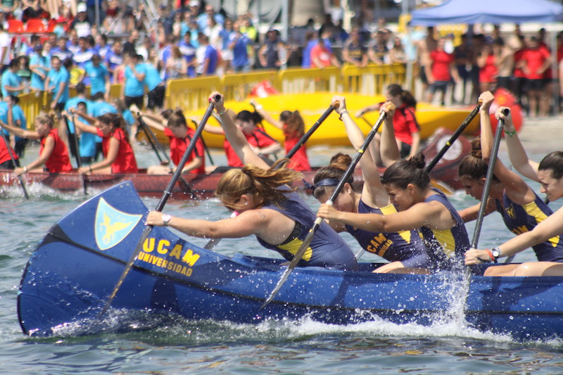 La de los Jerónimos, fue contundente en los 1.000 m. de la masculina, logrando detener el electrónico situado a pie de playa en 05:01,75 min. y embolsarse los 24 puntos en juego, dejando a los cadetes de la Academia General del Aire en 05:14,48 min. en una de sus mejores actuaciones. Los de la Politécnica de Cartagena fueron terceros con 05:20,94 y la Universidad de Murcia cuartos con 05:34,83 min. En mixtos, la Universidad de Murcia tradicionalmente presenta un equipo íntegramente femenino, pero en esta ocasión, los seis remeros y las cuatro féminas no fueron suficientemente rápidos, como los cinco remeros de ambos sexos de la UCAM, que llegó reforzada con dos piragüistas olímpicos, Maialen Chourraut (bronce en JJOO Londres ’12) y Sete Benavides (cuarto en JJOO de Londres ’12). Chourraut y Benavides capitanearon a San Antonio que se alzó con el podio con 05:09,30 min. La Universidad de Murcia por su parte, fue segunda con 05:27,71 min., dejando a los ofíciales de la Academia General del Aire terceros con 05:25,29 min. La Politécnica de Cartagena con 05:34,07 min. fue cuarta.