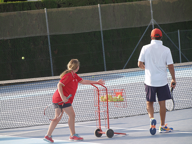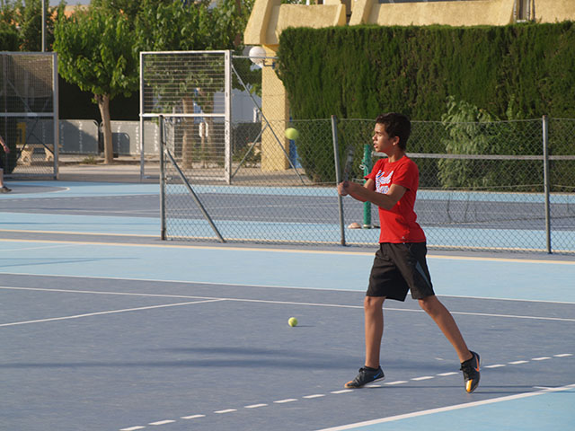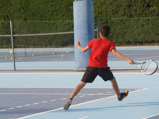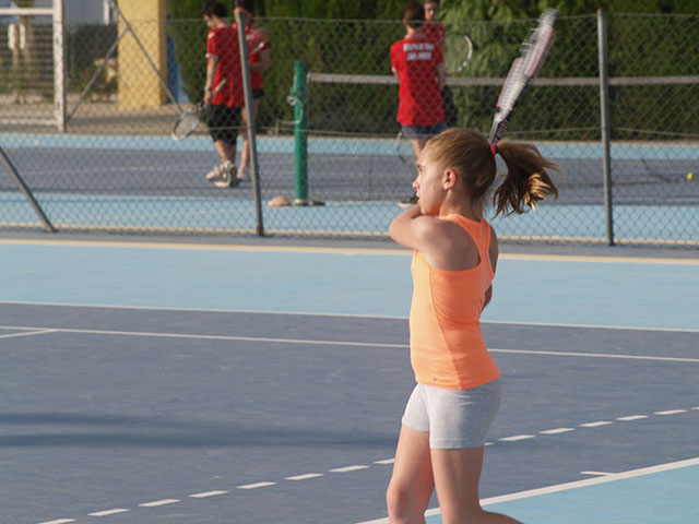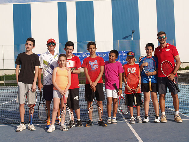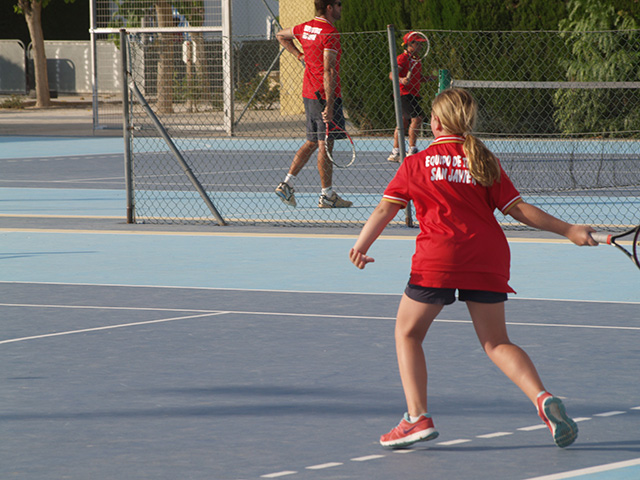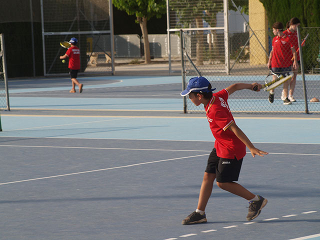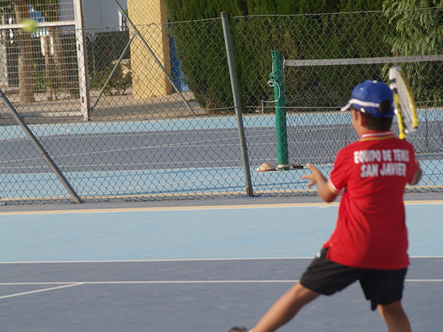 Desde primera hora de la tarde, en las instalaciones del Patronato Deportivo Municipal de San Javier, podemos escuchar las indicaciones de Oscar Soriano y Miguel Cánovas, profesores de la Escuela de Tenis: «Cambia el puño», «no subas el codo», «de lado, no te caigas para atrás».