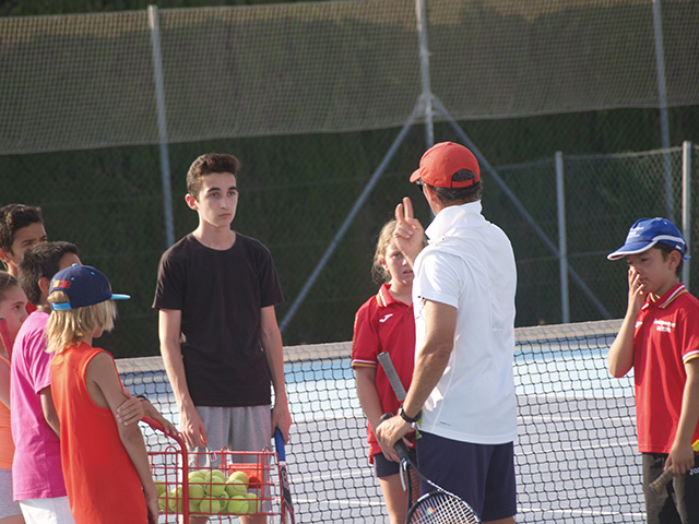 Las dos últimas horas de la tarde están dedicadas al módulo para adultos, donde se compagina alumnos de iniciación con avanzados. Y es aquí donde Óscar y Miguel realizan una labor sobresaliente, ya que tienen que formar a personas que, quizas, no han cogido jamás una raqueta entre sus manos. Al cabo de unos meses observamos cómo los novatos se integran con jugadores más avanzados, devolviendo bolas y participando en todas las fases del entrenamiento que ambos profesores planifican cada día.