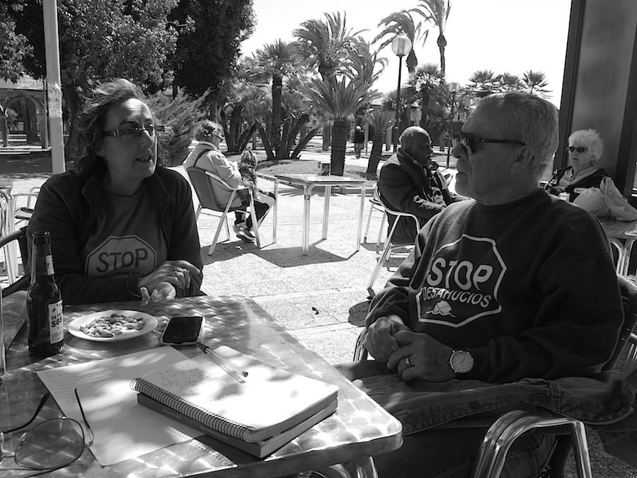 Charo Tárraga y Pepe Espinar se apuntaron desde el principio. A toda la lucha. Han hecho de escudo humano ante la puerta de cientos de viviendas para impedir el paso de los funcionarios del juzgado, vivieron momentos de tensión ‘ocupando’ oficinas bancarias cacerola en mano, y han visto perderlo todo a familias con hijos tan pequeños que no entendían lo que pasaba. «Me quedé muy afectado con el desahucio de Roldán. Te entra una impotencia…», cuenta Pepe Espinar en referencia a uno de los desalojos más recientes, de una familia con hijos de corta edad, al que se presentó el juez en persona e impidió que la Plataforma protegiera a la familia. «Era una casa muy muy humilde en una pedanía de Torre Pacheco, una vivienda en estado lamentable que el banco no va a poder vender, y el juez se presentó en persona para garantizar que se echaba a la familia. ¿Adónde nos lleva eso?», explica Pepe.