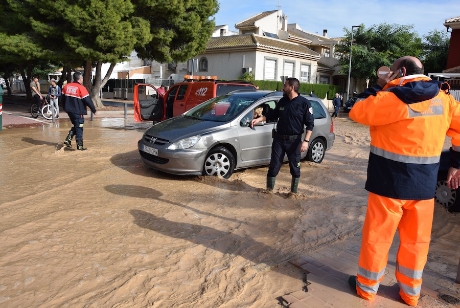 El agua ha llegado de nuevo con fuerza al casco urbano de los municipios del Mar Menor. Las lluvias dejaron entre 50 y 60 litros por metro cuadrado durante la noche, pero las escorrentías comenzaron a discurrir por las calles y avenidas horas después de que cayera la última gota. De hecho, en Los Alcázares se inundó la zona del instituto al mediodía. Aún así, los vecinos comenzaron ya la noche anterior a colocar maderas y ladrillos con yeso en las puertas, influidos aún por el recuerdo de las inundaciones de 2016.