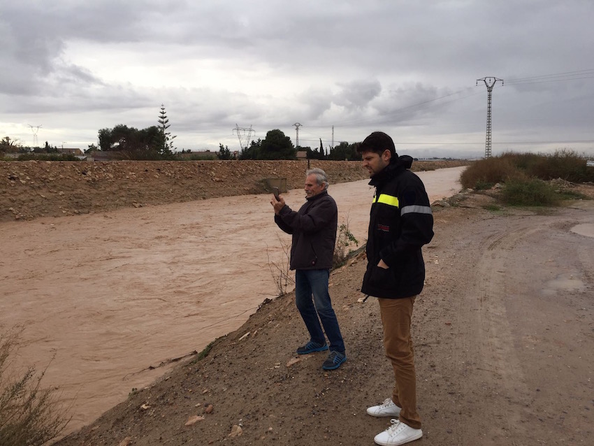 Los concejales de Los Alcázares Nicolás Ruíz y Paco Montesinos observan el caudal de la rambla del Albujón, que baja como un río hacia el Mar Menor.