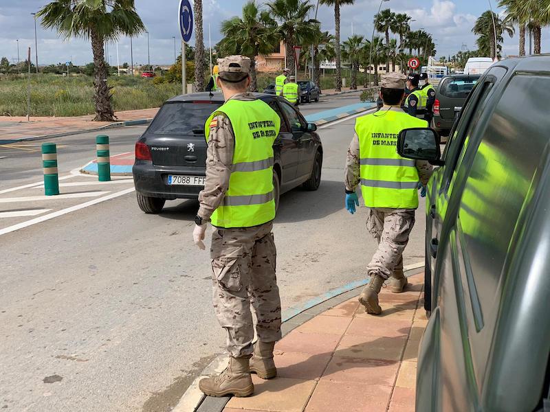 Control, esta misma mañana, SÁBADO, en la Nacional 332 de acceso a San Pedro del Pinatar con la Policía local y la Infatería de Marina, que tiene competencia para sancionar tras el decreto del Estado de Alarma.
