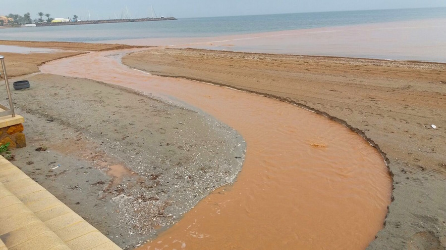 Las peores escenas de aguas pluviales avanzando, cargadas de suciedad hacua la laguna, se han podido ver en la zona sur. La orilla de Los Nietos y Mar de Cristal ya mostraba a media mañana un mar de color chocolate con numerosos canales abiertos en las playas desagüando en el Mar Menor.