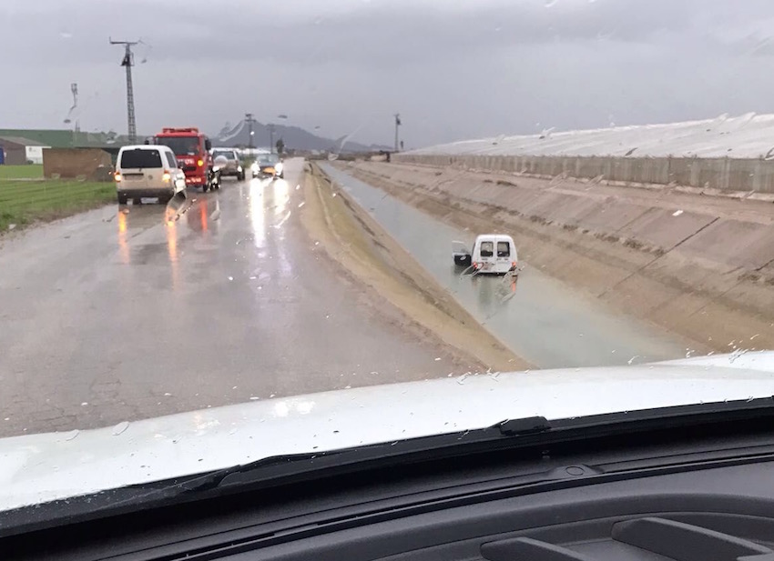 El mal estado del pavimento hizo que un vehículo se precipitara al canal del trasvase a la altura de El Mirador, desde donde tuvo que ser evacuado con una grúa. Caminos y cauces entre invernaderos se han convertido en ríos de barro.