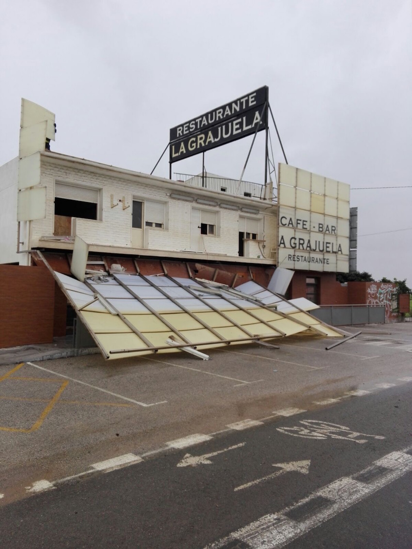 El temporal ha derribado el mural de un restaurante en San Javier, junto al centro comercial Dos Mares.