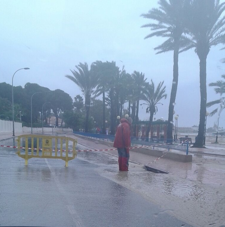 La avenida costera entre La Ribera y Lo Pagá, cortada hoy por las inundaciones.