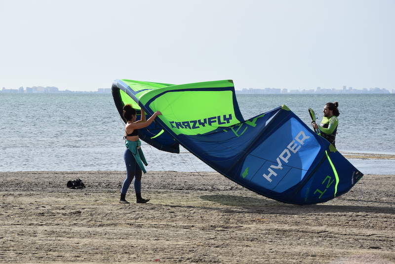 FOTO: Dos jóvenes pliegan la vela con la que han estado haciendo kitesurf en la playa de Los Narejos a primera hora de la mañana. Es el único uso de la playa permitido en las Fases 1 y 2 de la desescalada.