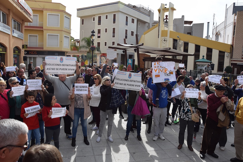‘No somos Venecia’, ‘No queremos más yeso, queremos souciones’ o ‘queremos dormir tranquilos’ han sido los mensajes que los vecinos exhibían en las pancartas. Un hombre llevó un carro con sacos de yeso y ladrillos como ‘regalo para inundaciones’. «El Albujón sacaba agua cada cinco años y ahora lo hace cinco veces al año», dijo el presidente de los Afectados.