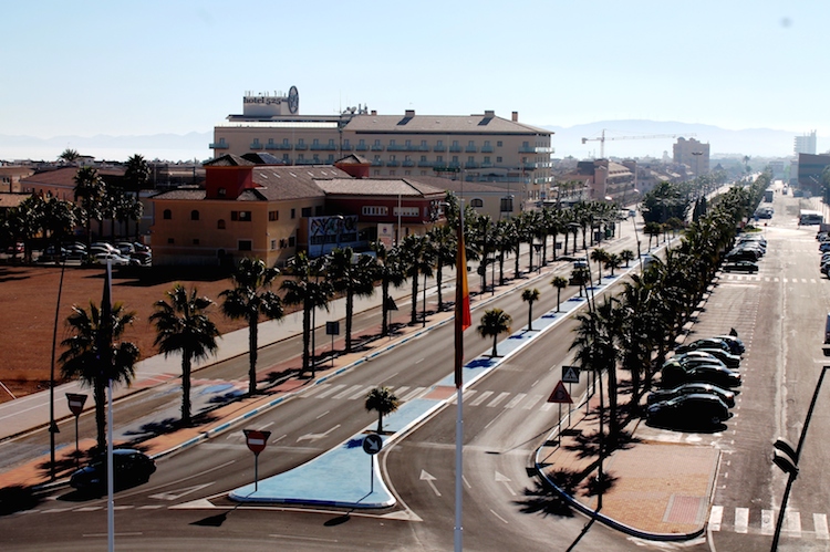 En la imagen, una vista de la avenida principal que une Los Alcázares con Los Narejos, donde ya se han colocado las nuevas luminarias