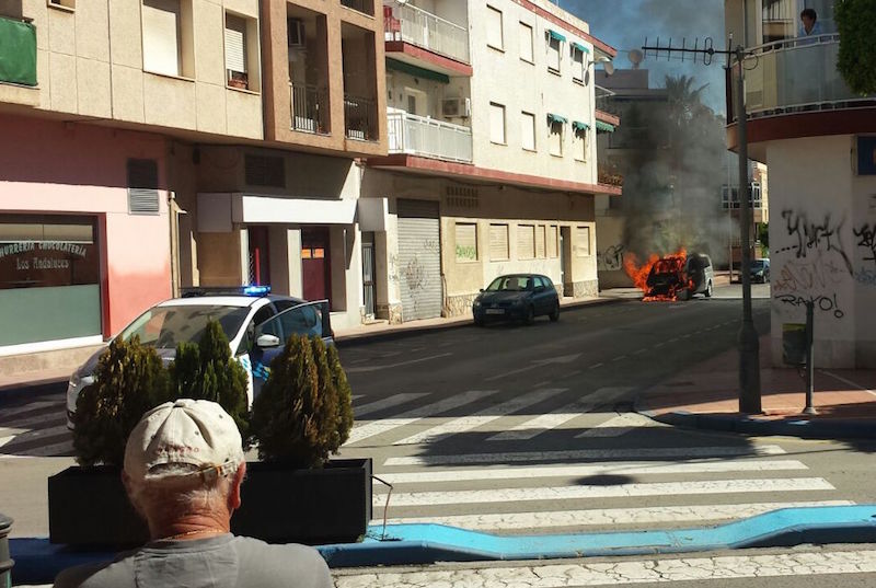 Un coche en llamas sorprendió ayer, jueves, por la mañana a los vecinos y transeúntes de Santiago de la Ribera. Tras la llamada al teléfono de emergencias, la Policía municipal cortó la calle San Martín de Porres, donde se produjo el suceso, y redujo el incendio con extintores a la espera de la llegada de los bomberos.