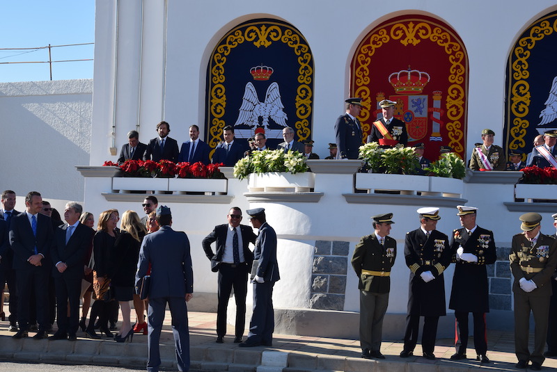 Un intenso sol reinó durante el acto militar, que contó con la asistencia del almirante de Acción Marítima, Juan Luis Soto, quien compartió la tribuna de honor con el coronel De la Chica. Asistieron al desfile aéreo y terrestre también desde el palco de honor los alcaldes de San Javier, José Miguel Luengo, y de Los Alcázares, Mario Pérez Cervera, junto al consejero de Empleo y Universidades, Miguel Motas, uno de los miembros de Ciudadanos integrados en el Gobierno regional.