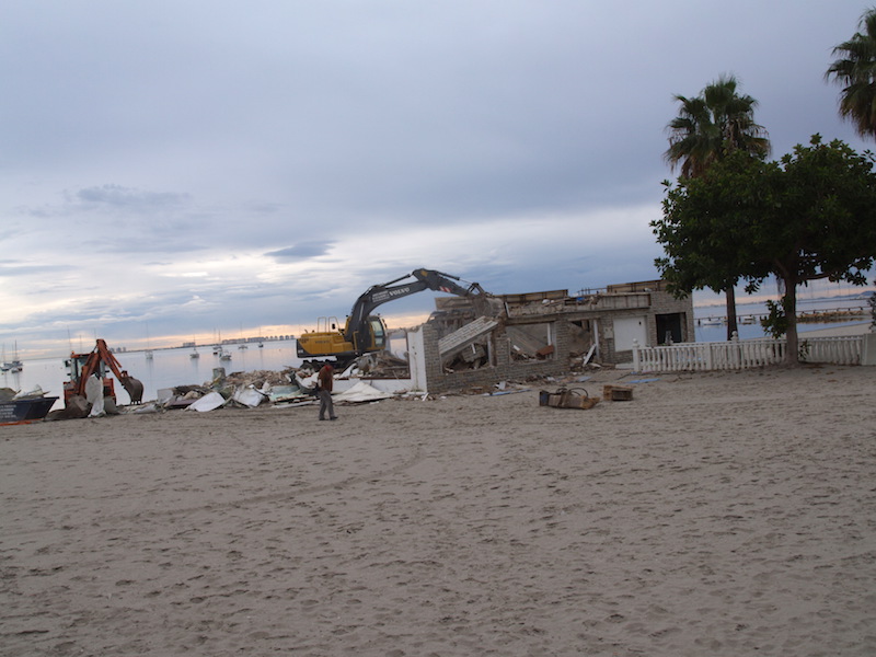 Ya es historia. La lonja Mar Menor formará parte, a partir de ahora, de la geografía del recuerdo, porque su silueta ya no existe en la playa de La Ribera. La pala acabó con ella esta misma mañana, solo una señama después de que cerrara sus puertas por orden judicial. Los escombros del negocio playero han despertado hoy el dolor y la indignación de los vecinos.