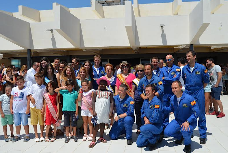 La formación al completo de la Patrulla Águila con la Comisión de Fiestas de La Ribera y sus cortes de honor