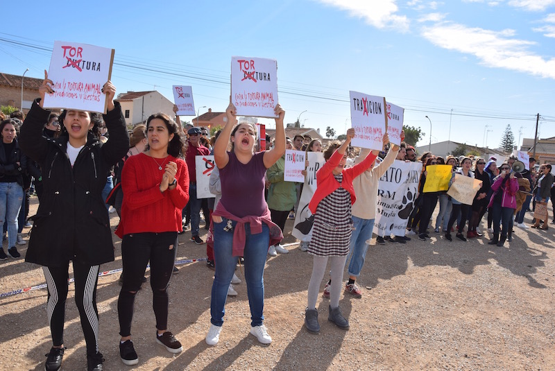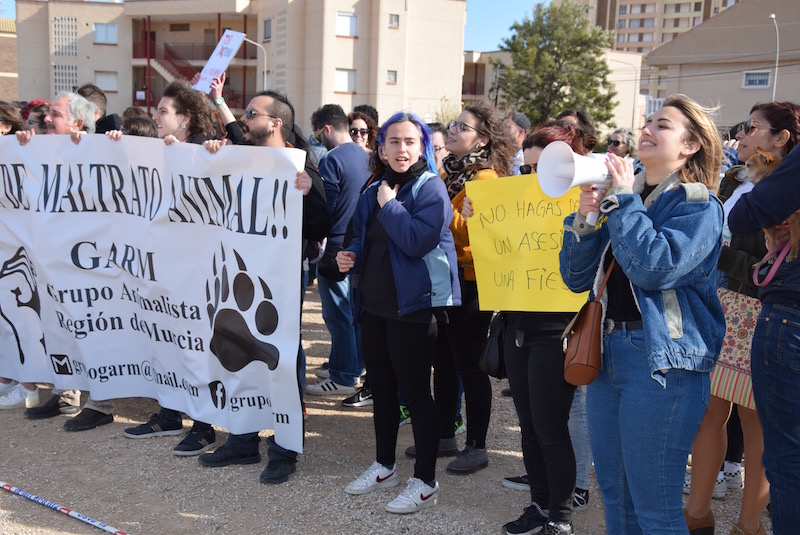 Jóvenes de San Javier, miembros del Grupo Animalista de la Región de Murcia e incluso un grupo de extranjeros se unieron a la protesta por el sacrificio animal.