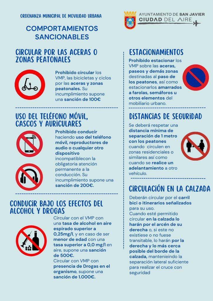 La ordenanza pone coto a la circulación de los patines eléctricos. La ordenaza prohíbe circular en estos vehículos a más de 25 kilómetros por hora. Los conductrores que circulen en patín con un acompañante se exponen a una sanción de hasta 500 euros. Tampoco pueden transportar animales, a riesgo de ser sancionados con multa de 200 euros.
