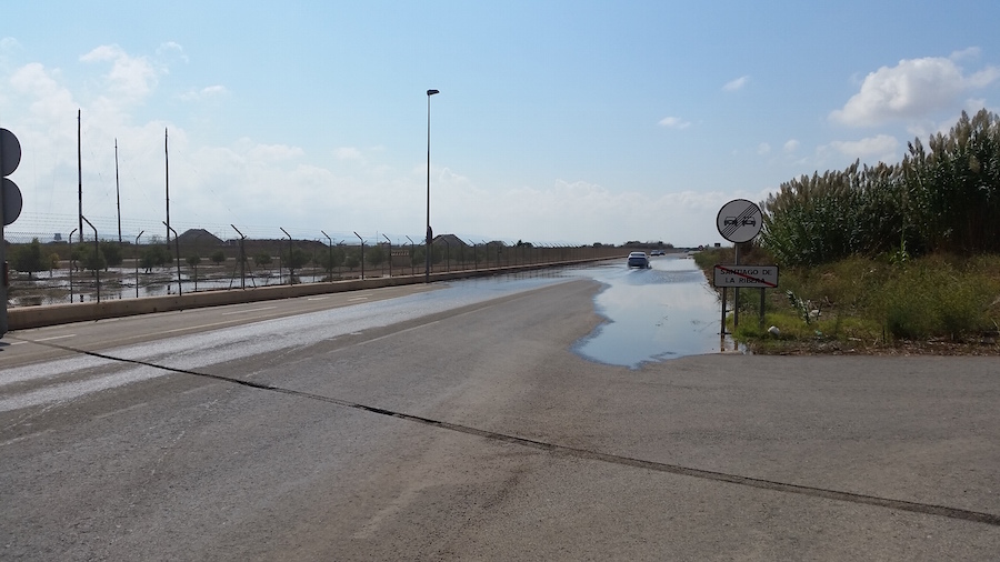 La carretera del aeropuerto desboradada por el atasco de aguas residuales, cerca de la Edar de San Javier.