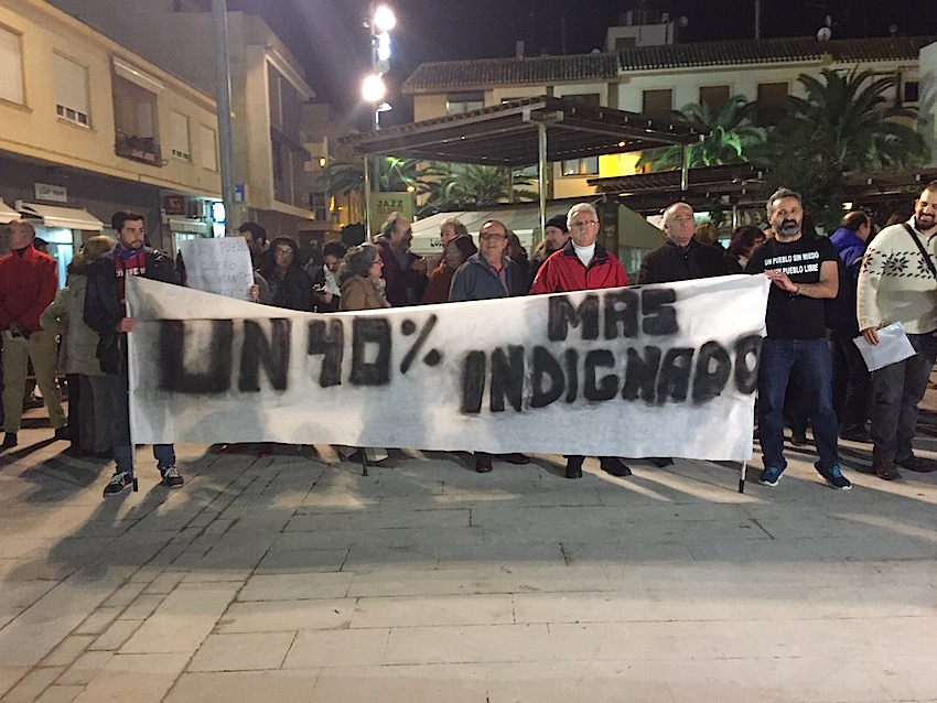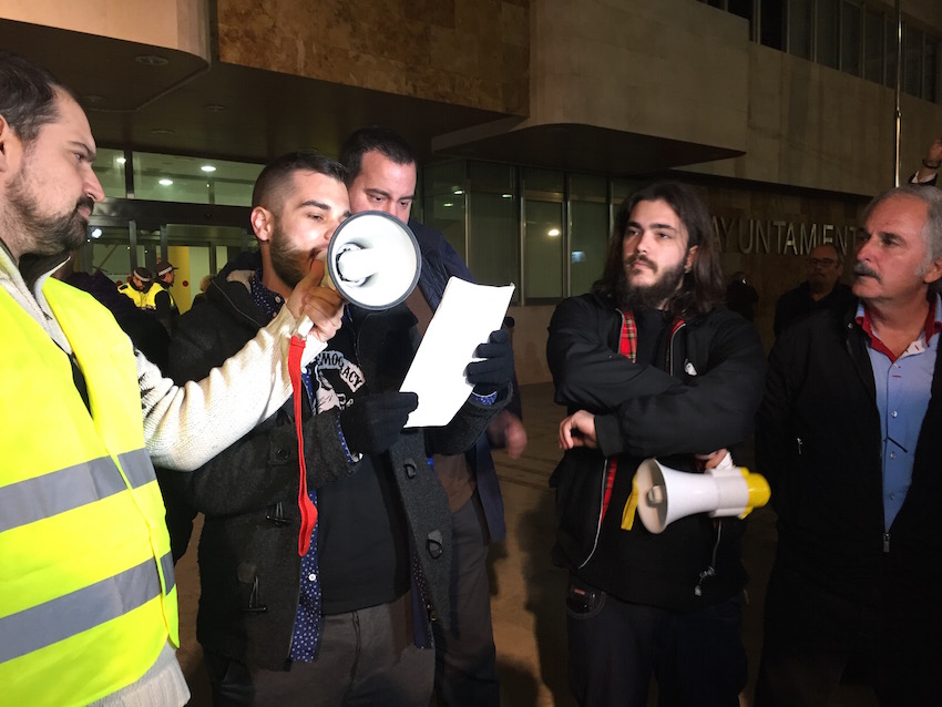 Miembros de la Plataforma de Afectados por las Hipotecas y de partidos políticos como PSOE, Ciudadanos y Podemos engrosaron la protesta, en la que sonaron a través de los megáfonos lemas combativos contra el incremento salarial de los políticos al tiempo que recordaban las recientes inundaciones y los daños que han causado en numerosas familias. El líder regional de Podemos, Óscar Urralburu, criticó «la subida de salarios de los concejales mientras hay una mayoría social sufriendo».