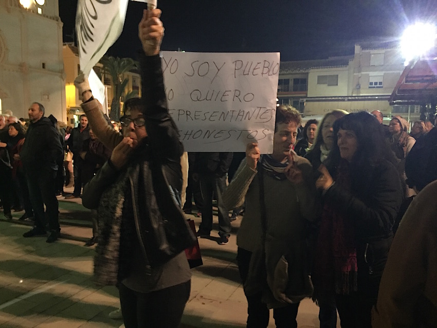 Pancartas y silbatos en la manifestación de anoche en la plaza de España de San Javier.