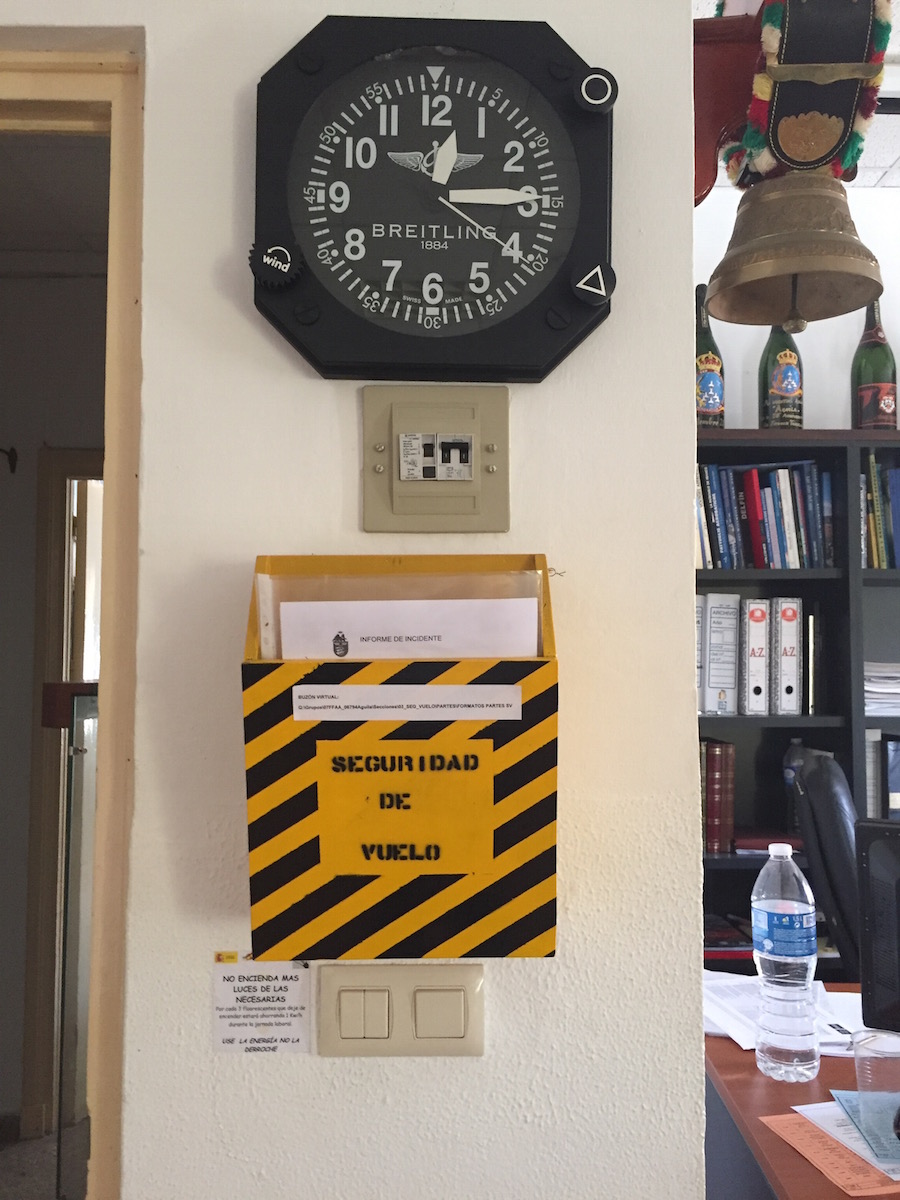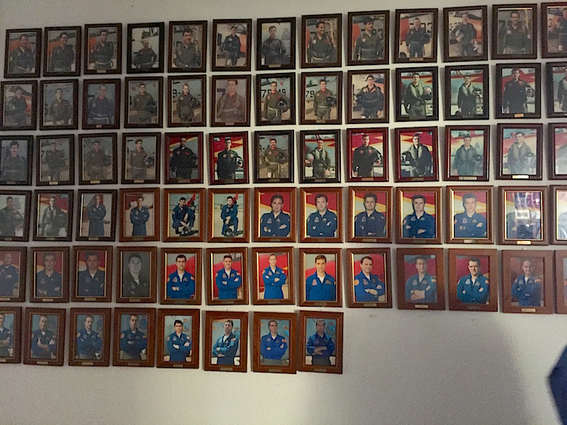 A los lados de la gran mesa de ‘briefing’ se disponen cinco mesas de trabajo con ordenadores. En el centro al fondo, la mesa del Jefe de la Patrulla, escoltada por varios cuadros de la Patrulla en distintas formaciones en el aire. Las paredes aparecen cubiertas de carteles conmemorativos de otras patrullas del mundo, desde la Patrouille francesa y los Frecce Tricolorique volarán en el Mar Menor este fin de semana, hasta la patrulla turca, la suiza o la británica. «Los Red Arrows perdieron a dos pilotos en plena exhibición», recuerda el comendante Roca, quien aclara que la Patrulla Águila mentiene limpio su expediente de accidentes.«No hay miedo, sino respeto. Siempre hay sustos que nos hacen tener canas, pero aprendemos de los errores, y todo está estudiado». Cada nueva acrobacia pasa por la lupa de la seguridad, como pasó este año con el ’30’, la innovación incorporada a la tabla con motivo del aniversario, cuyos números quedan suspendidos en el aire durante los breves segundos que permenecen las formas de humo.