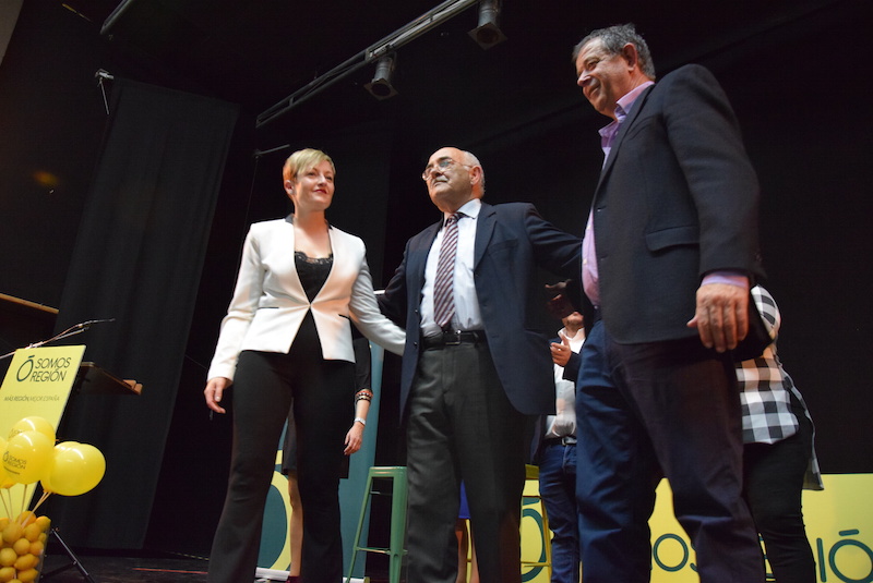 La candidata Mercedes Meroño y Epifanio Alcaráz, a ambos lados de Alberto Garre al final de la presentación de Somos Región.