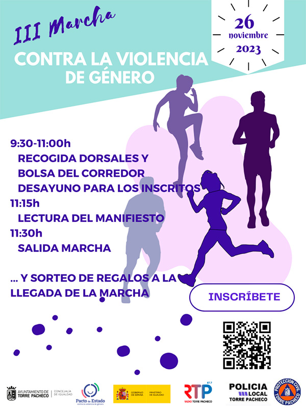 9,30 horas. III Marcha contra la Violencia de Género. Recorrido: 4 kilómetros. Salida y llegada en plaza del antiguo Ayuntamiento. Inscripción gratuita. Torre Pacheco.