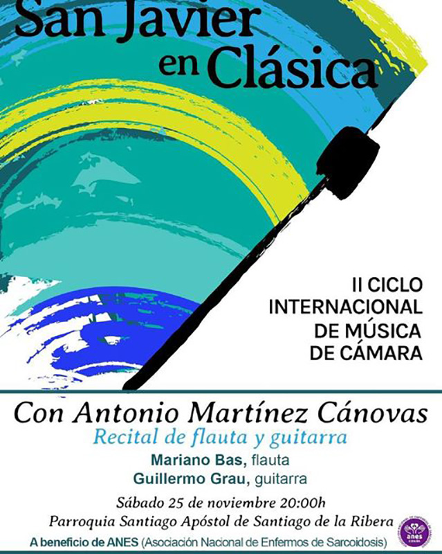 MÚSICA. II Ciclo Internacional de Música de Cámara. Con Antonio Martínez Cánovas. Recital de flauta y guitarra. Mariano Bas, flauta. Guillermo Grau, guitarra. Presenta la periodista Alexia Salas, directora de Noticiero Mar Menor y corresponsal de La Verdad. Entrada gratuita hasta completar aforo. El concierto se celebra a beneficio de la Asociación Nacional de Enfermos de Sarcoidosis, se instalará una urna para donativos voluntarios. Parroquia Santiago Apóstol de Santiago de la Ribera.