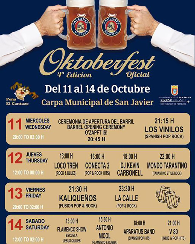 12 horas. MUSICA Y CERVEZA. 4ª Edición del Oktobert Fest. Recreación de la popular fiesta alemana con tres tipos de cervezas (Paulaner, Salvator y la tradicional de trigo) y las típicas salchichas alemanas, bretzel, strudel, pollo asado, costillares, hamburguesas, etc. Organiza Peña ´El Cantazo. Conciertos: Loco Tren (13 h.), Conecta 2 (16 h.), DJ Kevin Carbonell (18 h.) y Mondo Tarantino (22 h.). Carpa Municipal de San Javier.