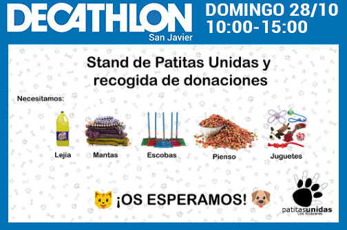 10 horas. SOLIDARIDAD. La asociación Patitas Unidas estará en la tienda de DECATHLON SAN JAVIER para recoger enseres y alimentos para sus mascotas.