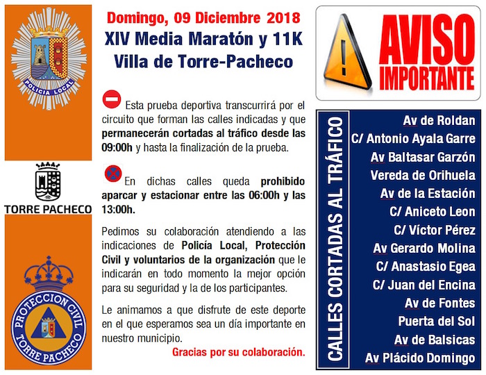 10 horas. DEPORTE. XIV Media Maratón Villa de Torre Pacheco y IV 11 kilómetros. Salida desde la avenida de Roldán de Torre Pacheco. Organizado por el Club de Atletismo de Torre Pacheco con el Ayuntamiento de Torre Pacheco.