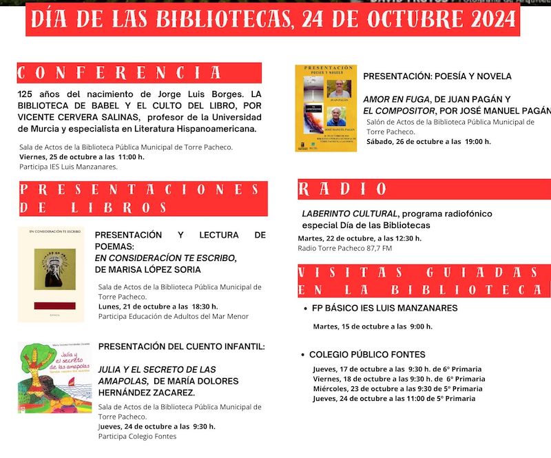 Por ultimo, Radio Torre Pacheco, realizará un programa especial  del ‘Laberinto Cultural’ dedicado  al día de las bibliotecas, el martes 22 de octubre a las 12.30 horas.