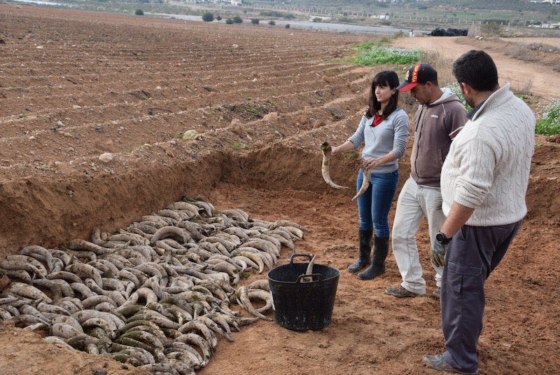 La técnico agrícola dirige la disposición de los cuernos para su enterramiento, que no debe ser muy profundo, pero sí a salvo de la lluvia y los encharcamientos.
