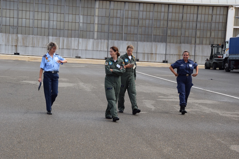 Un grupo de mujeres profesionales del Ejército del Aire, esta mañana en las pistas de la AGA. Ellas les contaron a las alumnas cómo han logrado vestir el uniforme de pilotos o de mecánicos de aeronaves o de controladora aérea.