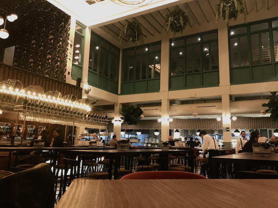 El mercado gastronómico nos da la posibilidad de probar diferentes tipos de cocinas. Está compuesto por una barra central para las bebidas: refrescos, cervezas, una carta de vinos, vermouth y coctelería. También encontrarás en uno de los laterales de esta barra un pequeño espacio donde ofrecen encurtidos. Alrededor están situados los doce puestos: ‘El timbre‘, con quesos, embutidos y jamón ibérico de bellota. ‘El disparate‘, con guisos y verduras (migas, patatas asadas con alioli, marineras, alcachofas en salsa, boquerones en vinagre).
