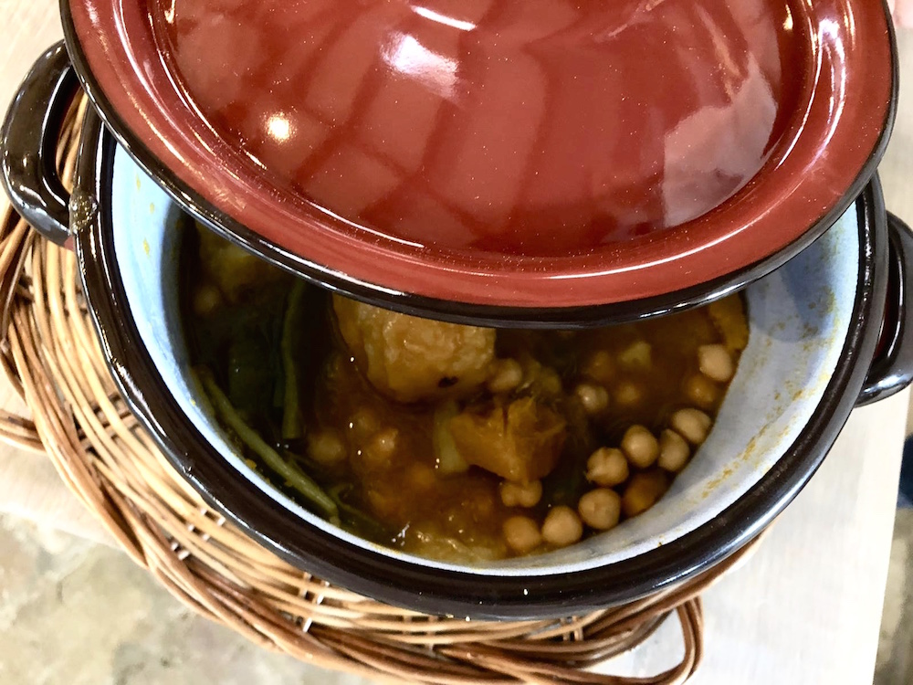 Comenzamos con los aperitivos: un pan de masa madre hecho en horno de leña en Fuente Álamo, con el que mojar un aceite de Jumilla o untar la sobrasada de Cartagena, junto a una tabla de embutidos y una tabla de quesos de San Isidro. Y pasamos a los platos de cuchara, todos presentados en vajilla de barro, cazuelas y platos antiguos de cristal. En este orden tomamos: caldo con pelotas, olla gitana con pera y hierbabuena, habichuelas con cerdo, morcilla y las manitas de cerdo en salsa. Las cocciones de las verduras, de las carnes, los fondos y las temperaturas no fallaron. Consiguió que todos los de la mesa contásemos anécdotas con emoción e ilusión nombrando a nuestros seres queridos comiendo esos mismos platos. Terminamos con unos postres, podéis imaginar lo que no faltó: tarta de la abuela, arroz con leche, tocino de cielo, natillas…