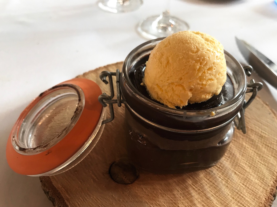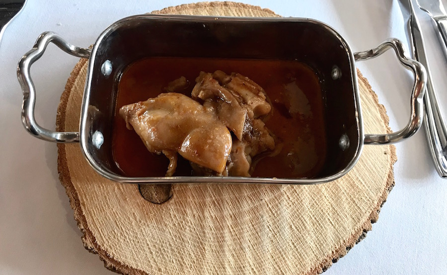 Comenzamos con los aperitivos: un pan de masa madre hecho en horno de leña en Fuente Álamo, con el que mojar un aceite de Jumilla o untar la sobrasada de Cartagena, junto a una tabla de embutidos y una tabla de quesos de San Isidro. Y pasamos a los platos de cuchara, todos presentados en vajilla de barro, cazuelas y platos antiguos de cristal. En este orden tomamos: caldo con pelotas, olla gitana con pera y hierbabuena, habichuelas con cerdo, morcilla y las manitas de cerdo en salsa. Las cocciones de las verduras, de las carnes, los fondos y las temperaturas no fallaron. Consiguió que todos los de la mesa contásemos anécdotas con emoción e ilusión nombrando a nuestros seres queridos comiendo esos mismos platos. Terminamos con unos postres, podéis imaginar lo que no faltó: tarta de la abuela, arroz con leche, tocino de cielo, natillas…