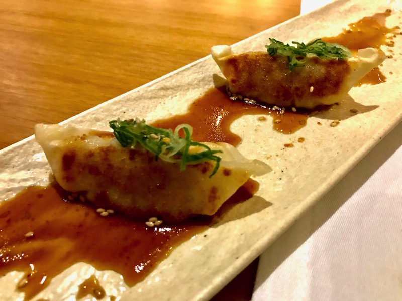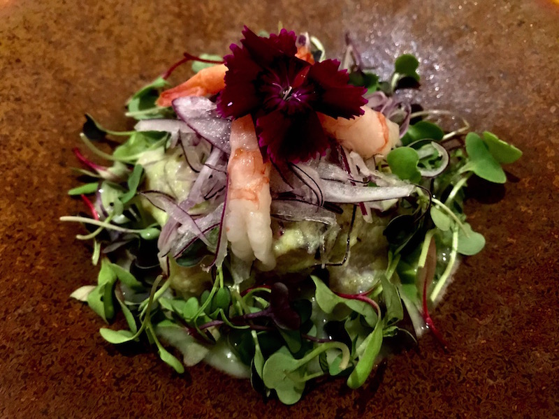 La cena comenzó con el reto de usar los palillos, ya que el aperitivo eran unos fideos de wasabi con jengibre, cebollino y limón. Un bocado con aromas y sabores orientales, ácidos y refrescantes para limpiar la boca antes de comenzar con el resto de los platos. Empecé probando el cebiche de corvina con un toque ahumado; unas gyozas de chato murciano jugosas; unas vieiras con crema de guisantes y sésamo negro y el Sexi Rocks, unos langostinos en tempura con salsa Kimuchi, potentes con un punto picante.