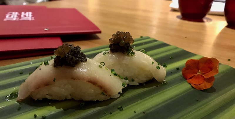 Atractivas presentaciones en Sexi Fish: Niguiri de pez limón con trufa con flor comestible.