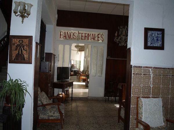 Atravesar la puerta de madera y cristal de los baños termales es como adentrarse en aquellos primeros años del siglo XX. Tal vez sonaba en algún gramófono del hotel alguna melodía de Ravel, en aquel año en que salieron al mercado los primeros discos de doble cara (1904), mientras los clientes cerraban los ojos para relajar su cuerpo sumergido en una de las tinas de mármol. Las lámparas de tubos de cristal aún decoran los techos altos de este ala del edificio que alzó Alfonso Carrión Belmonte en 1900, según data el historiador Serafín Alonso. Junto a las bañeras, los palanganeros de madera antiguos, con agua salada para templar el baño, ya que el médico prescribía la temperatura exacta del agua según fuera la dolencia a tratar.