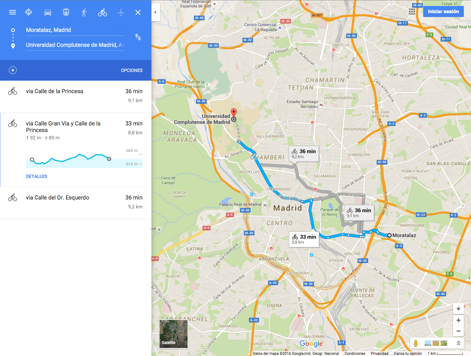 Esta es la diferencia principal. Aparte de ser más asequible que un coche, tardo menos en desplazarme. Realmente no hay comparación con otras formas de transporte en la ciudad. ¿Más rápido que en autobús? Sin problema. Tienes que esperar a que el autobús llegue y hacer docenas de paradas durante el trayecto, todo para quedarte a una distancia a pie relativamente asequible hasta tu destino. Una bicicleta eléctrica te lleva a donde tú quieras, cuando quieras, y en función de tu horario. ¿Más rápido que una bicicleta tradicional? Sí. Una bicicleta tiene la capacidad suficiente para realizar el mismo recorrido, pero no hay comparación en cuanto a la velocidad. Con una bicicleta eléctrica puedes acelerar para arrancar y después mantener una velocidad mayor, incluso en pendientes. Con las bicicletas tradicionales la gente gasta dinero en mejorarlas para optimizar su rendimiento y velocidad. A pesar de que es maravilloso poder subirte a una bicicleta y viajar mediante tu esfuerzo, las desventajas de las bicicletas convencionales para el desplazamiento diario urbano son evidentes. ¿Más rápido que un coche? Sorprendentemente sí. A pesar de que esto suene ilógico debido a que vas más lento que los coches (con el motor de 500w la asistencia al pedaleo te pone fácilmente a una velocidad punta de 45 kilómetros por hora), hay más cosas aparte de la velocidad punta. Mientras que los coches deben regirse por los semáforos, yo me desplazo por el carril bici. Es como si no hubiera tráfico. Además, cuando llego a mi destino, el aparcamiento es algo sencilla. Solamente tengo que asegurar la rueda y el asiento con un candado que evite los robos, por lo que solamente tendrás que preocuparte de bloquear el cuadro fijándolo a un objeto estático. ¿Cómo es de rápida? He hecho varias comparaciones usando Google maps para estimar el tiempo que requieren varias formas de transporte. Normalmente, el tiempo más parecido al de una bicicleta eléctrica es el de un coche; normalmente llego a los lugares unos minutos antes de lo que Google sugiere para un coche, y aparte de eso, no pierdo tiempo buscando aparcamiento. Es sorprendente lo rápido que puedes desplazarte cuando puedes sortear la mayor parte del tráfico y mantenerte a un ritmo constante de más de 30 kilómetros por hora. Aquí hay un mapa con mis destinos regulares, que van desde mi casa hasta el gimnasio.