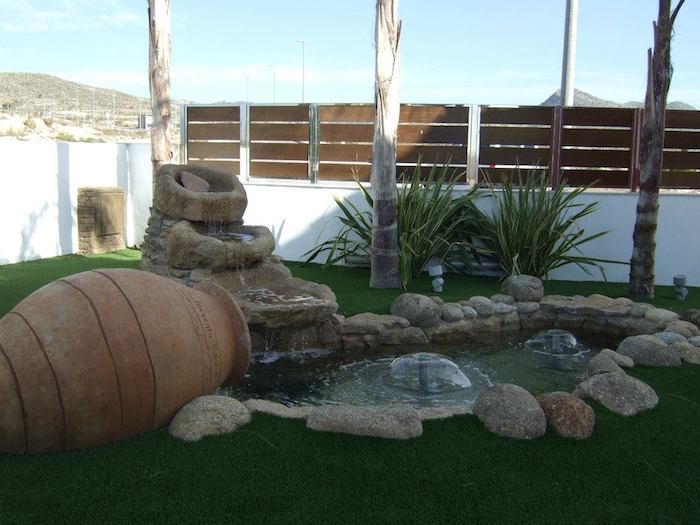 Fuentes y cascadas se pueden integrar perfectamente en un jardín moderno y sin costes elevados, ya que los nuevos sistemas de reciclado de agua permiten contar con el encanto y la frescura que aporta la visión y el ruido del agua a un espacio verde. La combinación de piedras, tinajas de barro y otros componentes decorativos es un recurso frecuente en los diseños de ALA 30, teniendo siempre en cuenta el ahorro de agua y energía.