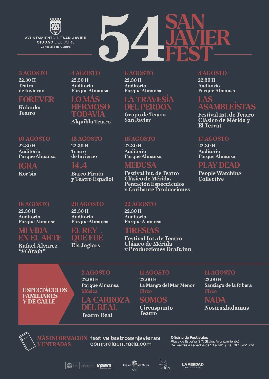 El auditorio se abrirá el 4 de agosto con el estreno de “Lo más hermoso todavía”, de Alba Saura, con Alquibla Teatro y con dirección de Antonio Saura. La obra, que cierra la “Trilogía del camino”, junto a “Mi cuerpo será camino” y “No me falte el aire”, transita por la vida de una reportera gráfica fallecida y nos invita a celebrar que “no se ha acabado nada, falta lo más hermoso todavía”. El Grupo de Teatro San Javier, heredero del grupo amateur que hace 54 años creó el Festival, tiene siempre su espacio en el Festival donde este año estrena “La travesía del perdón”, el 6 de agosto.