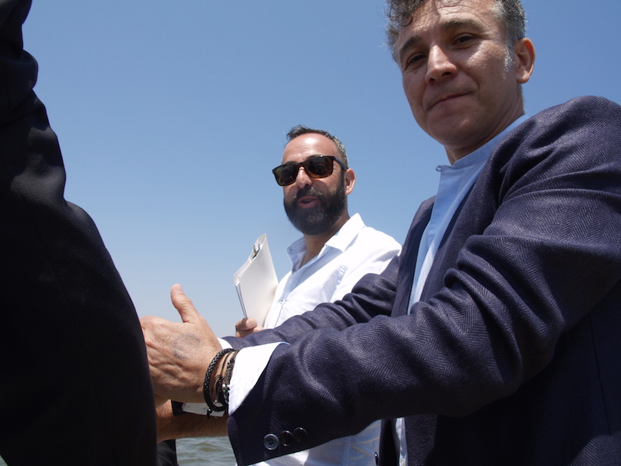 El pintor Nicolás de Maya, a la derecha, con el concejal de Cultura, David Martínez, en el barco de regreso de las encañizadas