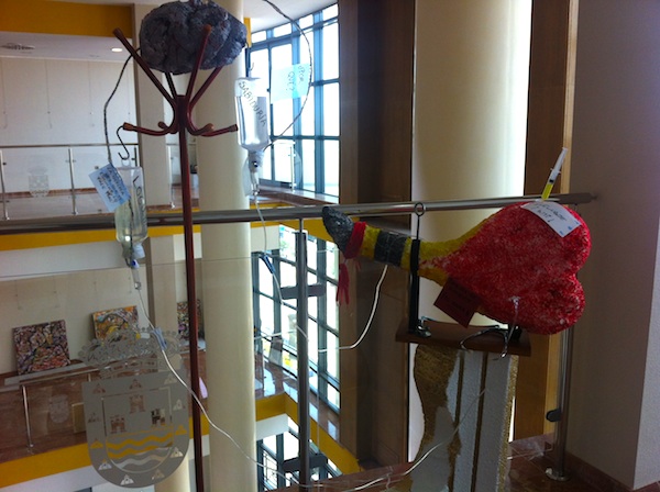El viernes, 10 de mayo, a las 20 horas, inauguran su exposición, la primera, en el Ayuntamiento de Los Alcázares, donde han invadido las cuatro plantas con cuadros y montajes escultóricos que no dejan indiferente, como el váter de Trino, un joven murciano que ha creado un rincón para el WC un tanto tortuoso, o un gotero que alimenta a un corazón de cartón piedra. La inauguración incluirá un concierto en el Consistorio y un espacio para la literatura.