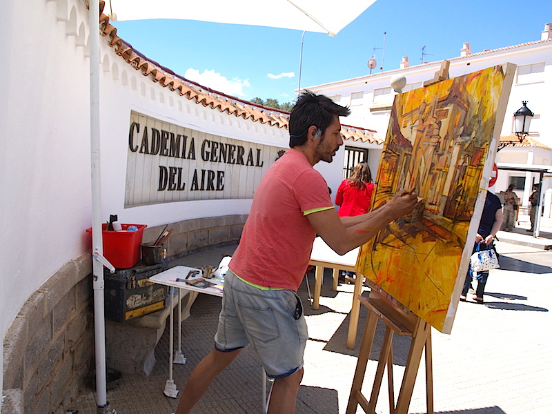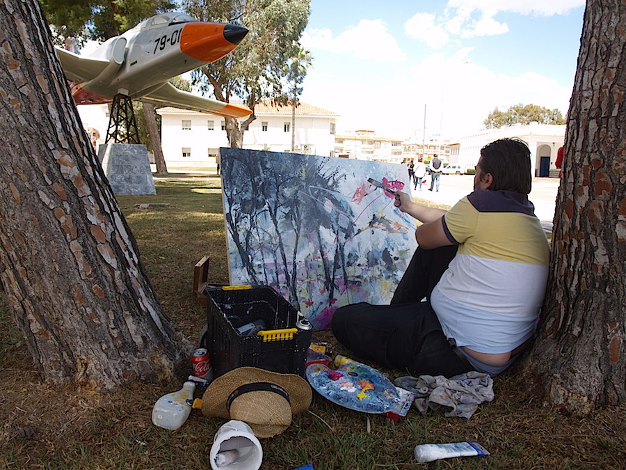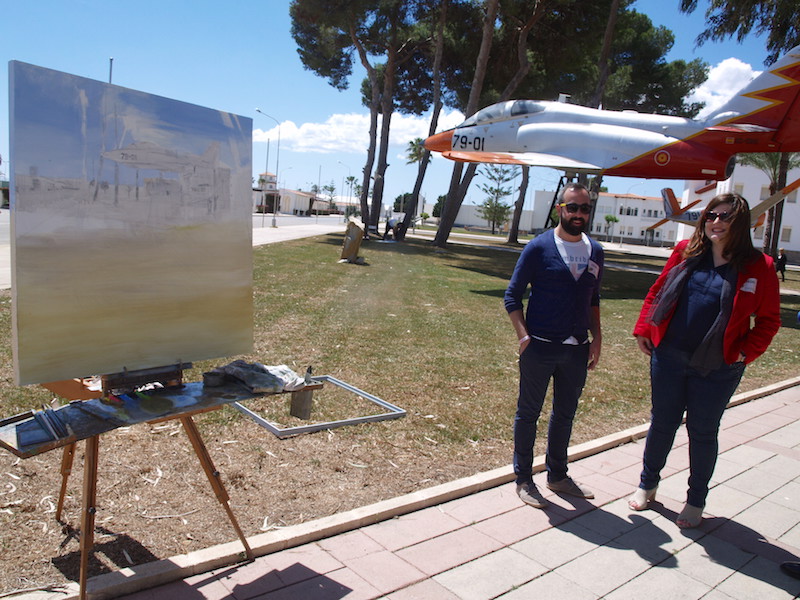 El valenciano Gonzalo Romero, que se desplazó desde su ciudada hasta Santiago de la Ribera para participar en el Concurso de Pintura al Aire Libre, se llevó el promer premio con una personal vista de la explanada militar donde se encuentra anclado el C-101, el modelo de avión que emplea la patrulla Águila. El artista se había refugiado bajo el enorme ficus que da sombra al jardín ubicado junto a la armería, para protegerse del viento que incordió a los artistas moviendo los caballetes y adhiriendo a los óleos y acrílicos todo tipo de hojas e insectos volantes.