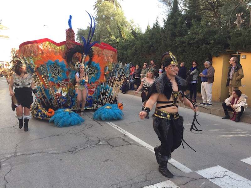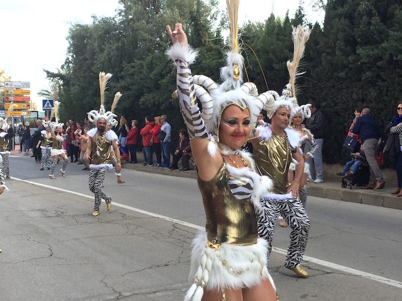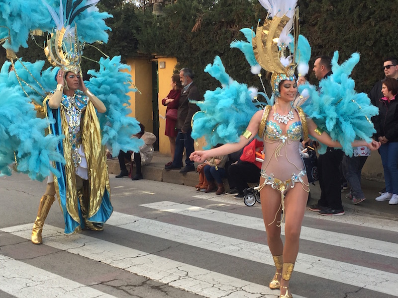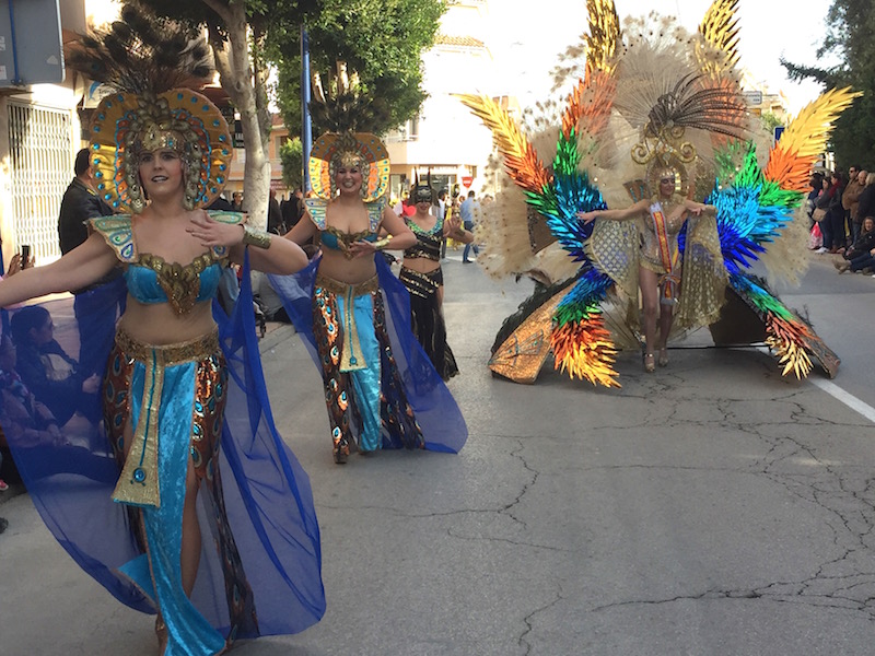El sol se reflejó en las plumas doradas de las ninfas de Akelarre, que abrían paso a la corte de Cleopatra y sus egipcias danzarinas de la comparsa Río. La reina del Carnaval de La Ribera, Irene Pérez Mateo, puso el broche de lujo a la parte local del desfile, que continuó con las comparsas de los municipios invitados.