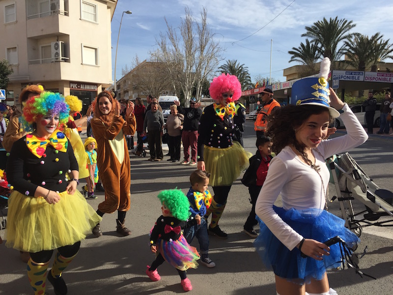 Los personajes circenses de la Escuela Infantil de San Javier abrieron el desfile, que este año brilló bajo un sol primaveral que permitió al público disfrutar de una tarde animada sin los molestos vientos de otras ediciones.