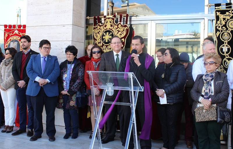 El pasado domingo por la mañana, como es tradición desde 2011, miembros de las cofradías, vecinos y autoridades recorrieron las calles del municipio junto a los representantes de la Junta Mayor, y las bandas de cornetas y tambores de las distintas cofradías para darse cita a las puertas del Ayuntamiento, donde se realizó el Anuncio de Cuaresma por parte del párroco, José Antonio García. A continuación tuvo lugar el acto protocolario en el que la presidenta de la Junta Mayor de Cofradías, Mari Carmen Villaescusa, realizó la petición formal al alcalde, José Fidel Ros, para el acondicionamiento de las calles y los desfiles procesionales de Semana Santa.