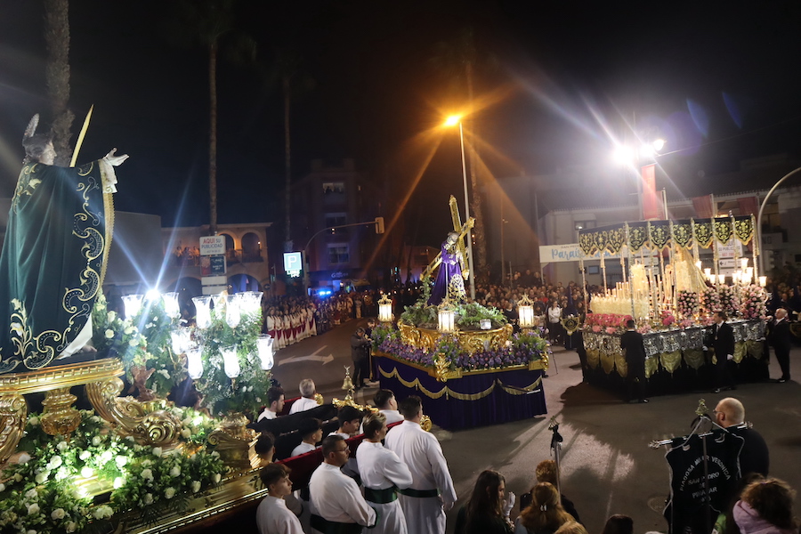 El cruce de la calle Emilio Castelar y la avenida de Las Salinas fue una vez más el lugar elegido para vivir uno de sus momentos más emotivos y esperados de la Semana Santa pinatarense, con la procesión del Encuentro de Jesús con su Santísima Madre en la Calle de la Amargura, un desfile procesional que rememora el encuentro de Jesús Nazareno, escoltado por el tercio romano, con la Virgen de los Dolores, ante la mirada de San Juan Evangelista y La Piadosa Verónica.