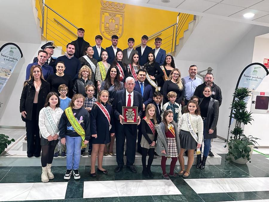 Foto del pregonero, Mariano Pérez, con las cortes infantil y juvenil, con el presidente de la Comisión de Fiestas, Ricardo Luna, y miembros de la Corporación municipal.